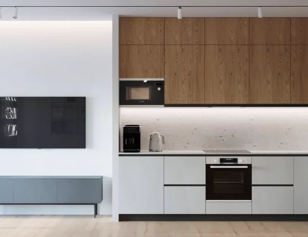 Акцентами стали – дерево светлого оттенка и синий цвет, именно они придали цвету и натуральности пространства.
