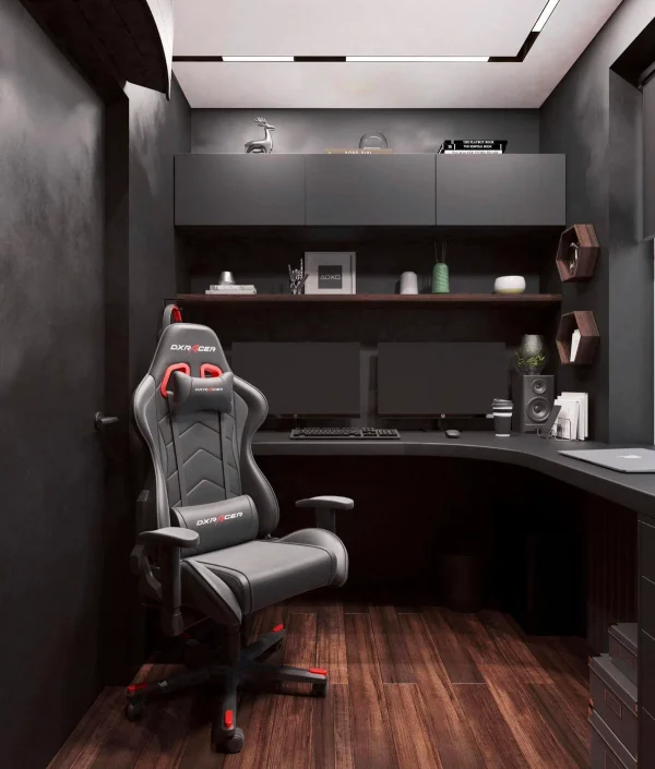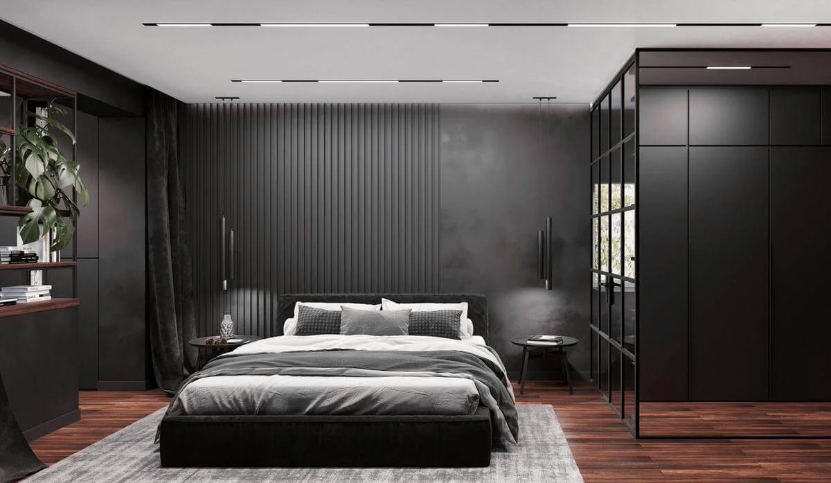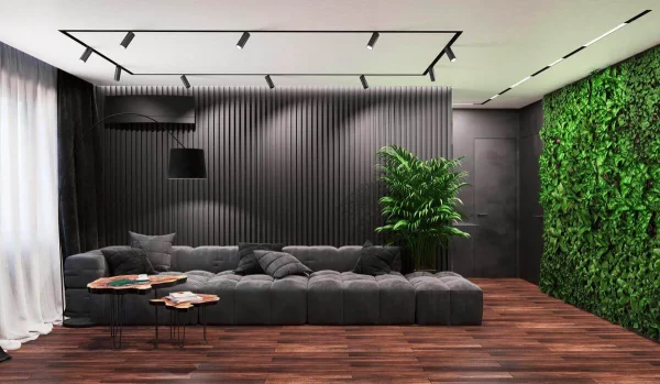 Стены обработаны мебельными панелями и декоративной штукатуркой, что придает разнообразие фактур и натуральность в пространстве