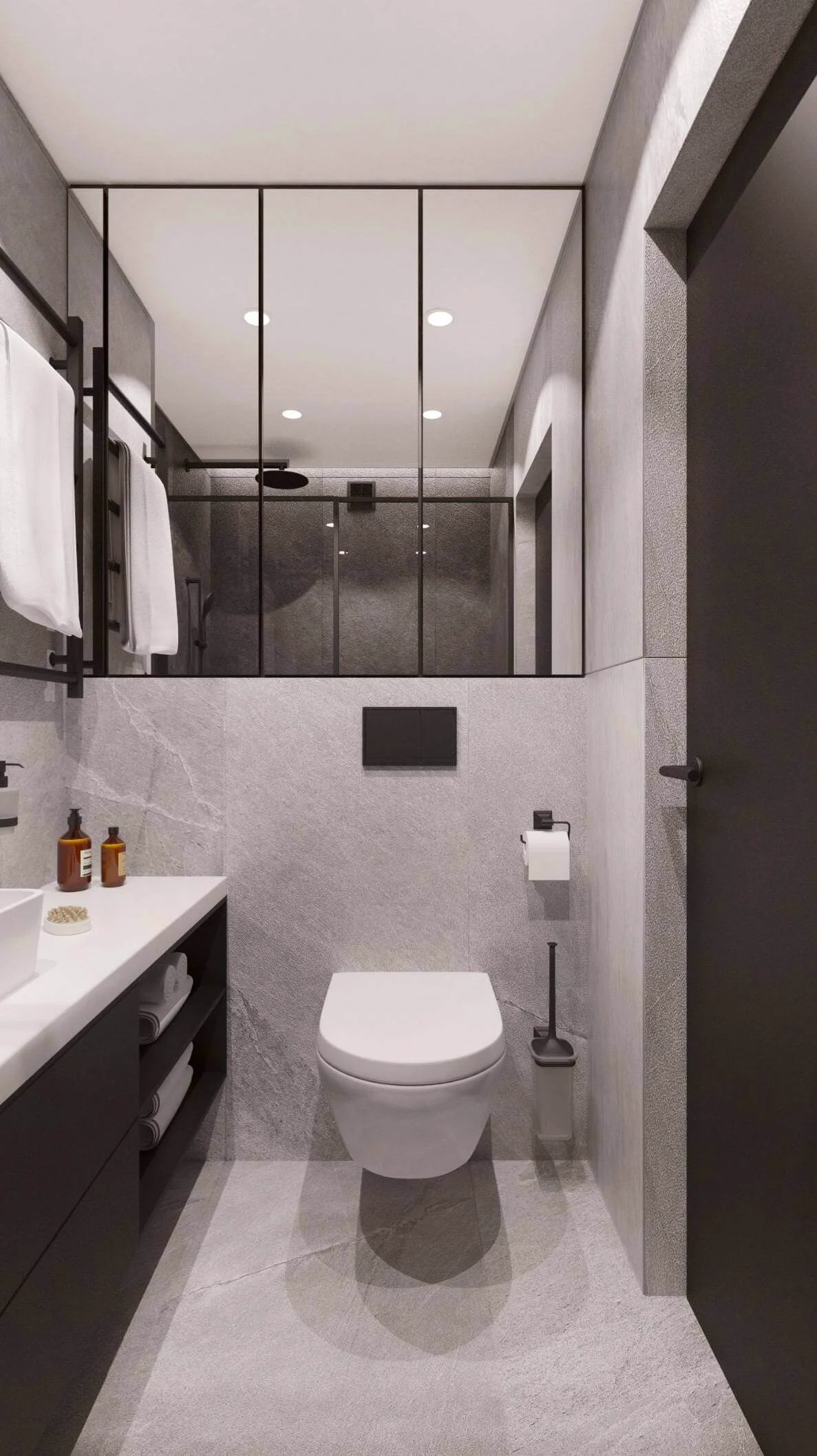 Также особенностью проекта выступают необычный выбор керамогранитной плитки в общей зоне и ванной комнате, конечно же по всей квартире использовали теплые полы.
